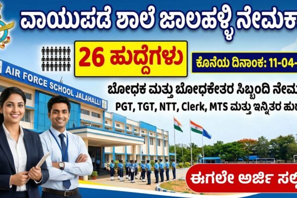 ಹಲೋ ಸ್ನೇಹಿತರೇ ನಮಸ್ಕಾರ, ನೀವು ಶಿಕ್ಷಕ ವೃತ್ತಿಯಲ್ಲಿ ಆಸಕ್ತಿ ಹೊಂದಿದ್ದೀರಾ? ಬೆಂಗಳೂರಿನಲ್ಲೇ ಒಂದು ಗೌರವಾನ್ವಿತ ಸಂಸ್ಥೆಯಲ್ಲಿ ಕೆಲಸ ಮಾಡುವ ಕನಸು ನಿಮ್ಮದಾಗಿದೆಯೇ? ಹಾಗಿದ್ದರೆ ನಿಮಗಾಗಿ ಇಲ್ಲಿದೆ ಒಂದು ಭರ್ಜರಿ ಸುದ್ದಿ! ಬೆಂಗಳೂರಿನ ವಾಯುಪಡೆ ಶಾಲೆ ಜಾಲಹಳ್ಳಿ (Air Force School Jalahalli) ಖಾಲಿ ಇರುವ ವಿವಿಧ ಶಿಕ್ಷಕರ ಹುದ್ದೆಗಳನ್ನು ಭರ್ತಿ ಮಾಡಲು ಅಧಿಕೃತ ಅಧಿಸೂಚನೆ ಹೊರಡಿಸಿದೆ. ನೇಮಕಾತಿ ಮಾಹಿತಿ: ಶೈಕ್ಷಣಿಕ ಅರ್ಹತೆ: ಸಂಬಳ: ವಯೋಮಿತಿ: ಅರ್ಜಿ ಸಲ್ಲಿಸುವುದು ಹೇಗೆ? ಪ್ರಮುಖ ದಿನಾಂಕಗಳು: ಪ್ರಮುಖ ಲಿಂಕ್ಗಳು: ವಾಟ್ಸಾಪ್ ಗ್ರೂಪ್ ಇಲ್ಲಿ ಕ್ಲಿಕ್ ಮಾಡಿ…