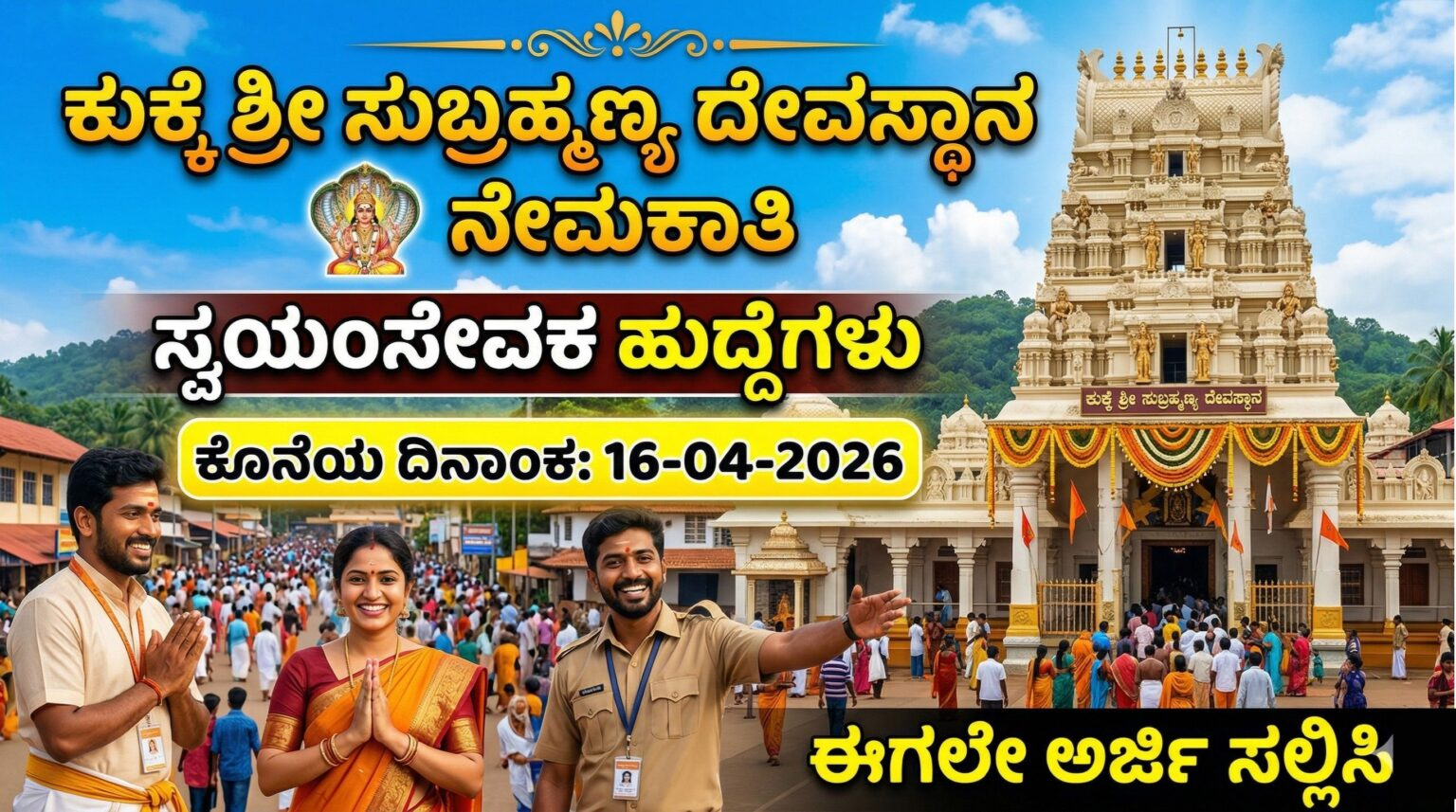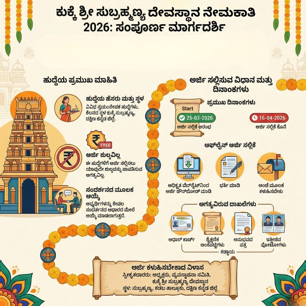 ನಮಸ್ಕಾರ ಸ್ನೇಹಿತರೇ, ದಕ್ಷಿಣ ಭಾರತದ ಅತ್ಯಂತ ಪ್ರಸಿದ್ಧ ನಾಗಕ್ಷೇತ್ರ ಹಾಗೂ ಕಡಬ ತಾಲ್ಲೂಕಿನ ಪುಣ್ಯಭೂಮಿಯಾದ ಕುಕ್ಕೆ ಶ್ರೀ ಸುಬ್ರಹ್ಮಣ್ಯ ದೇವಸ್ಥಾನದಲ್ಲಿ ಸೇವೆ ಸಲ್ಲಿಸುವ ಹಂಬಲ ನಿಮಗಿದೆಯೇ? ಹಾಗಿದ್ದರೆ ನಿಮಗೊಂದು ಸಂತೋಷದ ಸುದ್ದಿ! ಕರ್ನಾಟಕ ಸರ್ಕಾರದ ಹಿಂದೂ ಧಾರ್ಮಿಕ ದತ್ತಿ ಇಲಾಖೆಯ ಅಡಿಯಲ್ಲಿ ಬರುವ ಈ ಪ್ರಸಿದ್ಧ ದೇವಾಲಯದ ಆಡಳಿತ ಮಂಡಳಿಯು 2026ನೇ ಸಾಲಿನ ವಿವಿಧ ಸ್ವಯಂಸೇವಕರ (Volunteers) ಹುದ್ದೆಗಳನ್ನು ಭರ್ತಿ ಮಾಡಲು ಅಧಿಕೃತ ನೇಮಕಾತಿ ಅಧಿಸೂಚನೆಯನ್ನು ಹೊರಡಿಸಿದೆ.