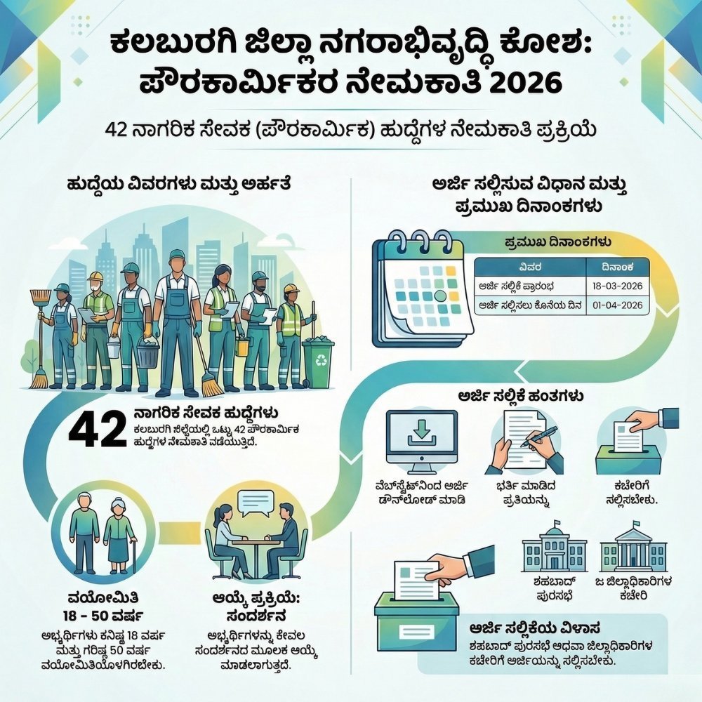 ನೀವು ಹಂಚಿಕೊಂಡಿರುವ ಮಾಹಿತಿ ಪ್ರಕಾರ, District Urban Development Cell Kalaburagi ವತಿಯಿಂದ 2026ರ ನೇಮಕಾತಿ ಪ್ರಕಟಣೆ ಹೊರಬಂದಿದೆ. ಇದನ್ನು ಸರಳವಾಗಿ ಮುಖ್ಯ ಅಂಶಗಳಾಗಿ ಇಲ್ಲಿದೆ 👇