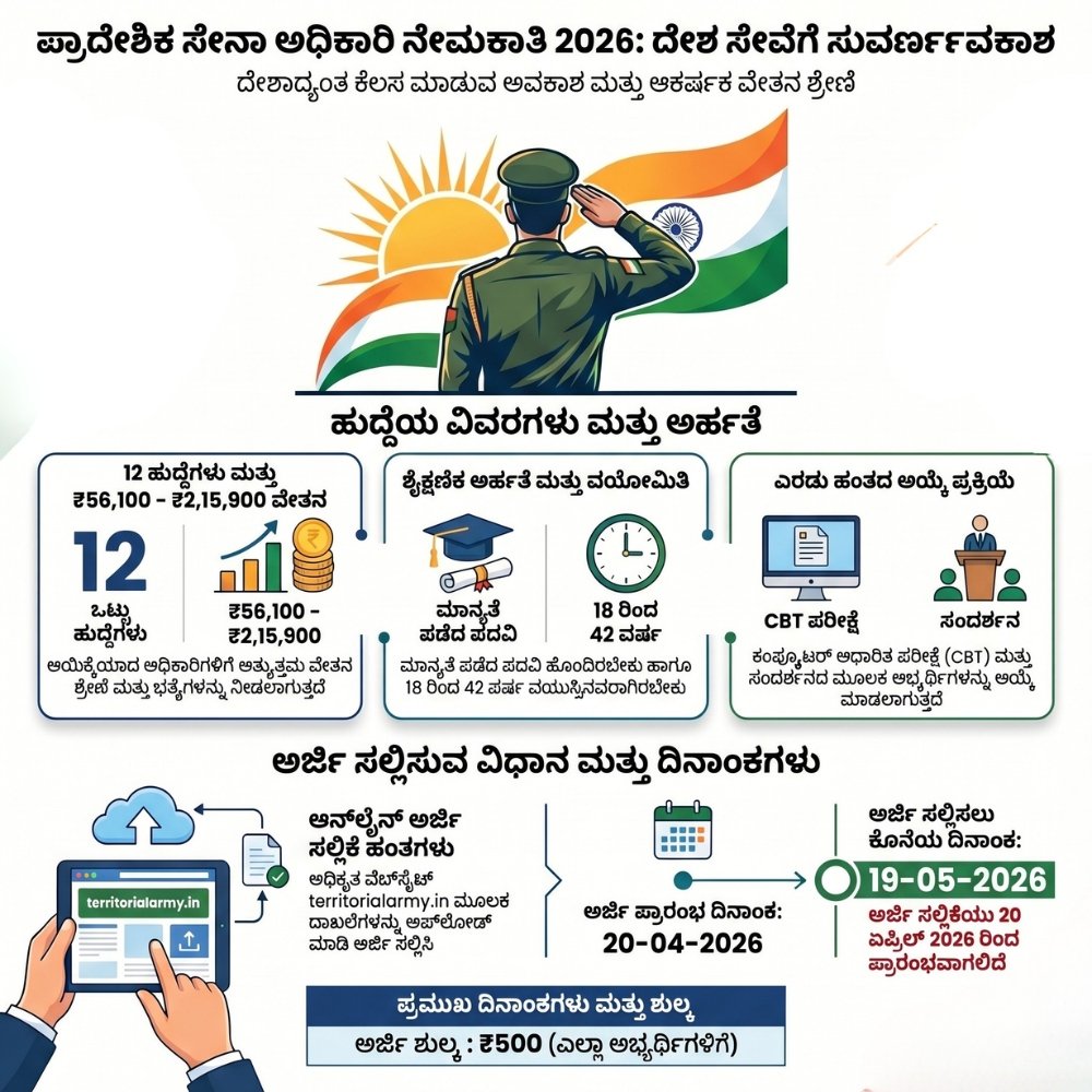 ಹಲೋ ಸ್ನೇಹಿತರೇ ನಮಸ್ಕಾರ, ನೀವು ಪದವಿ ಮುಗಿಸಿ ದೇಶ ಸೇವೆ ಮಾಡುವ ಹಂಬಲ ಹೊಂದಿದ್ದೀರಾ? ಹಾಗಿದ್ದರೆ ನಿಮಗೊಂದು ಸುವರ್ಣಾವಕಾಶ ಕಾಯುತ್ತಿದೆ. ಭಾರತೀಯ ಪ್ರಾದೇಶಿಕ ಸೇನೆಯು 2026ನೇ ಸಾಲಿನ ಅಧಿಕಾರಿ ಹುದ್ದೆಗಳ ಭರ್ತಿಗೆ ಅಧಿಕೃತ ಅಧಿಸೂಚನೆ ಹೊರಡಿಸಿದೆ.