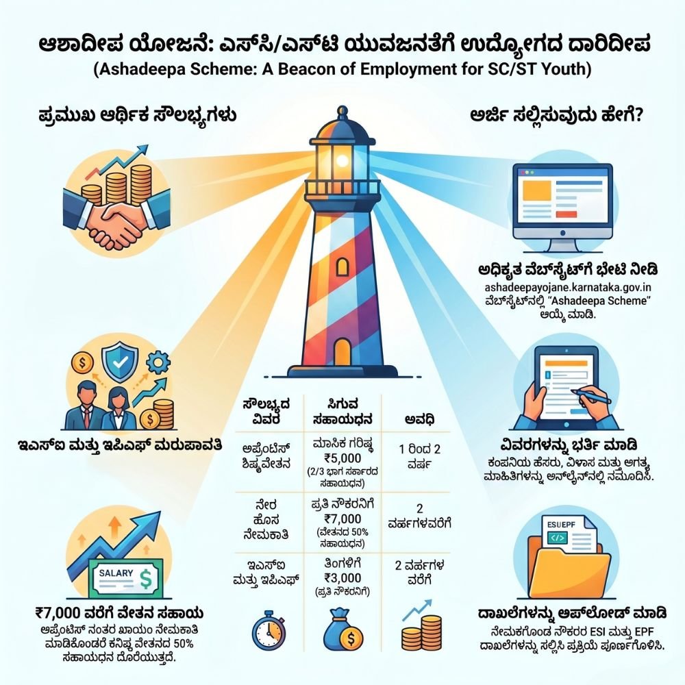 ಹಲೋ ಸ್ನೇಹಿತರೇ ನಮಸ್ಕಾರ,ನೀವು ಅಥವಾ ನಿಮ್ಮ ಸ್ನೇಹಿತರು ಖಾಸಗಿ ಕಂಪನಿಗಳಲ್ಲಿ ಕೆಲಸ ಹುಡುಕುತ್ತಿದ್ದೀರಾ? ಹಾಗಿದ್ದರೆ ಕರ್ನಾಟಕ ಸರ್ಕಾರದ ‘ಆಶಾದೀಪ’ ಯೋಜನೆ ಬಗ್ಗೆ ನೀವು ತಿಳಿಯಲೇಬೇಕು. ಪರಿಶಿಷ್ಟ ಜಾತಿ ಮತ್ತು ಪರಿಶಿಷ್ಟ ಪಂಗಡದ (SC/ST) ನಿರುದ್ಯೋಗಿ ಯುವಕರಿಗೆ ಇದು ಬದುಕಿನ ದಾರಿದೀಪವಾಗಲಿದೆ. ಕೇವಲ ಕೆಲಸ ಅಷ್ಟೇ ಅಲ್ಲ, ತರಬೇತಿ ಅವಧಿಯಲ್ಲಿ ಕೈತುಂಬಾ ಹಣವೂ ಸಿಗಲಿದೆ.