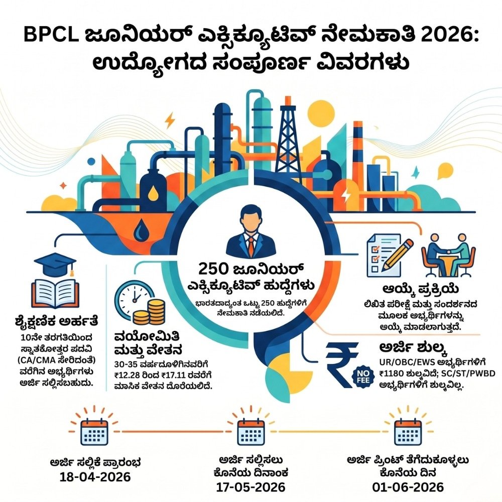 ನಿಮ್ಮ ಕನಸಿನ ಉದ್ಯೋಗಕ್ಕಾಗಿ ಕಾಯುತ್ತಿದ್ದೀರಾ? ಸಾರ್ವಜನಿಕ ವಲಯದ ಪ್ರತಿಷ್ಠಿತ ಸಂಸ್ಥೆಯಾದ ಭಾರತ್ ಪೆಟ್ರೋಲಿಯಂ ಕಾರ್ಪೊರೇಷನ್ ಲಿಮಿಟೆಡ್ (BPCL) ನಿಂದ ನಿರುದ್ಯೋಗಿಗಳಿಗೆ ಸಿಹಿ ಸುದ್ದಿಯೊಂದು ಬಂದಿದೆ. ಅಖಿಲ ಭಾರತ ಮಟ್ಟದಲ್ಲಿ ಖಾಲಿ ಇರುವ 250 ಜೂನಿಯರ್ ಎಕ್ಸಿಕ್ಯೂಟಿವ್ ಹುದ್ದೆಗಳ ಭರ್ತಿಗೆ ಅಧಿಕೃತ ಅಧಿಸೂಚನೆ ಹೊರಡಿಸಲಾಗಿದೆ.