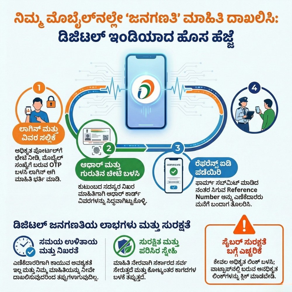 ಭಾರತದಲ್ಲಿ ಜನಗಣತಿ (Census) ಅಂದ ಕೂಡಲೇ ನಮಗೆ ನೆನಪಾಗುವುದು ಮನೆ ಮನೆಗೆ ಬರುವ ಎಣಿಕೆದಾರರು ಮತ್ತು ಅವರು ಕೇಳುವ ಸಾಲು ಸಾಲು ಪ್ರಶ್ನೆಗಳು. ಆದರೆ ಈ ಬಾರಿ ಕೇಂದ್ರ ಸರ್ಕಾರ ಒಂದು ದೊಡ್ಡ ಬದಲಾವಣೆ ತಂದಿದೆ. ಇನ್ಮುಂದೆ ನೀವು ಎಣಿಕೆದಾರರಿಗಾಗಿ ಕಾಯಬೇಕಿಲ್ಲ, ಬದಲಾಗಿ ನಿಮ್ಮ ಕೈಯಲ್ಲೇ ಇರುವ ಸ್ಮಾರ್ಟ್ಫೋನ್ ಮೂಲಕವೇ ನಿಮ್ಮ ಮಾಹಿತಿಯನ್ನು ದಾಖಲಿಸಬಹುದು.