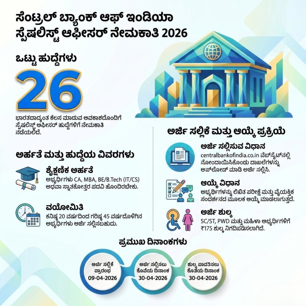 ನೀವು ಬ್ಯಾಂಕಿಂಗ್ ಕ್ಷೇತ್ರದಲ್ಲಿ ಒಂದು ಉತ್ತಮ ಉದ್ಯೋಗಕ್ಕಾಗಿ ಕಾಯುತ್ತಿದ್ದೀರಾ? ಹಾಗಾದರೆ ನಿಮಗೊಂದು ಸುವರ್ಣ ಅವಕಾಶ! ಸೆಂಟ್ರಲ್ ಬ್ಯಾಂಕ್ ಆಫ್ ಇಂಡಿಯಾ (CBI) 2026ನೇ ಸಾಲಿನ ನೇಮಕಾತಿಗಾಗಿ ಅಧಿಸೂಚನೆಯನ್ನು ಹೊರಡಿಸಿದೆ. ಸ್ಪೆಷಲಿಸ್ಟ್ ಆಫೀಸರ್ (SO) ಹುದ್ದೆಗಳಿಗೆ ಅರ್ಹ ಅಭ್ಯರ್ಥಿಗಳಿಂದ ಅರ್ಜಿ ಆಹ್ವಾನಿಸಲಾಗಿದ್ದು, ಆಯ್ಕೆಯಾದವರಿಗೆ ಅಖಿಲ ಭಾರತ ಮಟ್ಟದಲ್ಲಿ ಕೆಲಸ ಮಾಡುವ ಅವಕಾಶ ಸಿಗಲಿದೆ.