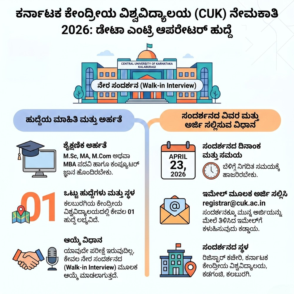 ಹಲೋ ಸ್ನೇಹಿತರೇ ನಮಸ್ಕಾರ, ನೀವು ಸ್ನಾತಕೋತ್ತರ ಪದವಿ (PG) ಮುಗಿಸಿ ಉತ್ತಮ ಸರ್ಕಾರಿ ಪರಿಸರದಲ್ಲಿ ಕೆಲಸ ಹುಡುಕುತ್ತಿದ್ದೀರಾ? ಹಾಗಿದ್ದರೆ ನಿಮಗೊಂದು ಸಿಹಿ ಸುದ್ದಿ. ಕರ್ನಾಟಕ ಕೇಂದ್ರೀಯ ವಿಶ್ವವಿದ್ಯಾಲಯವು (CUK) ಖಾಲಿ ಇರುವ ಹುದ್ದೆಗಳ ಭರ್ತಿಗೆ ಮುಂದಾಗಿದ್ದು, ಅರ್ಹ ಅಭ್ಯರ್ಥಿಗಳನ್ನು ನೇರ ಸಂದರ್ಶನದ ಮೂಲಕ ಆಯ್ಕೆ ಮಾಡುತ್ತಿದೆ.