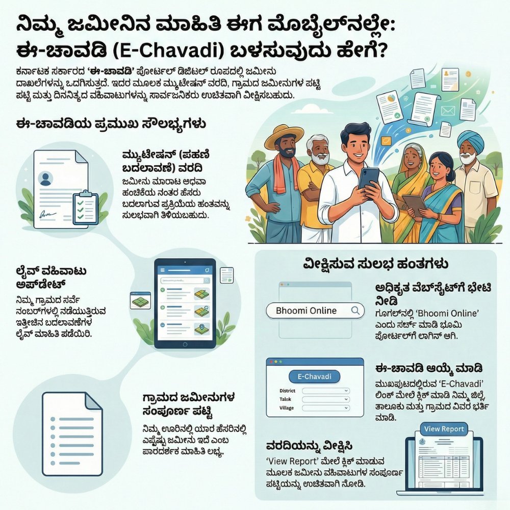 ಹೆಲೋ ಸ್ನೇಹಿತರೆ ನಮಸ್ಕಾರ, ನಿಮ್ಮ ಗ್ರಾಮದ ಜಮೀನುಗಳ ವಹಿವಾಟು ಹೇಗಿದೆ? ಯಾರ ಜಮೀನು ಯಾರ ಹೆಸರಿಗೆ ವರ್ಗಾವಣೆಯಾಗಿದೆ? ನಿಮ್ಮ ಆಸ್ತಿಯ ಮ್ಯುಟೇಷನ್ (ಪಹಣಿ ಬದಲಾವಣೆ) ಸ್ಥಿತಿ ಏನಿದೆ? ಈ ಎಲ್ಲಾ ಮಾಹಿತಿಗಾಗಿ ಇನ್ಮುಂದೆ ನೀವು ತಹಶೀಲ್ದಾರ್ ಕಚೇರಿಗೋ ಅಥವಾ ನಾಡಕಚೇರಿಗೋ ಅಲೆಯಬೇಕಾದ ಅಗತ್ಯವಿಲ್ಲ. ಕರ್ನಾಟಕ ಸರ್ಕಾರದ ‘ಈ-ಚಾವಡಿ’ (E-Chavadi) ಪೋರ್ಟಲ್ ಮೂಲಕ ಮನೆಯಲ್ಲೇ ಕುಳಿತು ನಿಮ್ಮ ಮೊಬೈಲ್ನಲ್ಲಿ ಎಲ್ಲವನ್ನೂ ಉಚಿತವಾಗಿ ವೀಕ್ಷಿಸಬಹುದು.