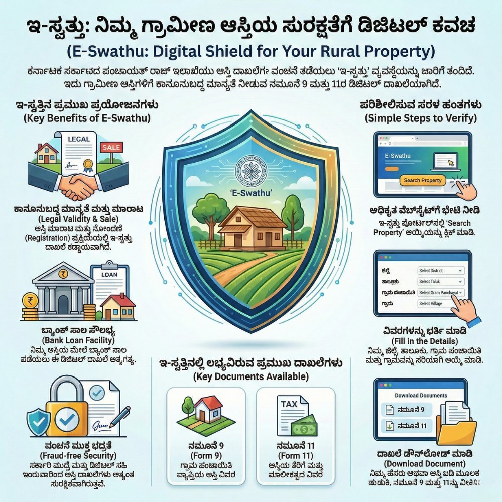 ಹೆಲೋ ಸ್ನೇಹಿತರೆ ನಮಸ್ಕಾರ, ನೀವು ಗ್ರಾಮೀಣ ಭಾಗದಲ್ಲಿ ಅಥವಾ ಪಂಚಾಯಿತಿ ವ್ಯಾಪ್ತಿಯಲ್ಲಿ ಆಸ್ತಿ ಹೊಂದಿದ್ದೀರಾ? ಹಾಗಾದರೆ ಈ ಲೇಖನವನ್ನು ತಪ್ಪದೇ ಕೊನೆಯವರೆಗೂ ಓದಿ. ಏಕೆಂದರೆ, ಇಂದು ನಿಮ್ಮ ಆಸ್ತಿಗೆ ಅಸಲಿ ಬೆಲೆ ಮತ್ತು ಕಾನೂನುಬದ್ಧ ಮಾನ್ಯತೆ ಸಿಗಬೇಕಾದರೆ ಅದು ‘ಇ-ಸ್ವತ್ತು’ (E-Swathu) ಆಗಿರಲೇಬೇಕು.
