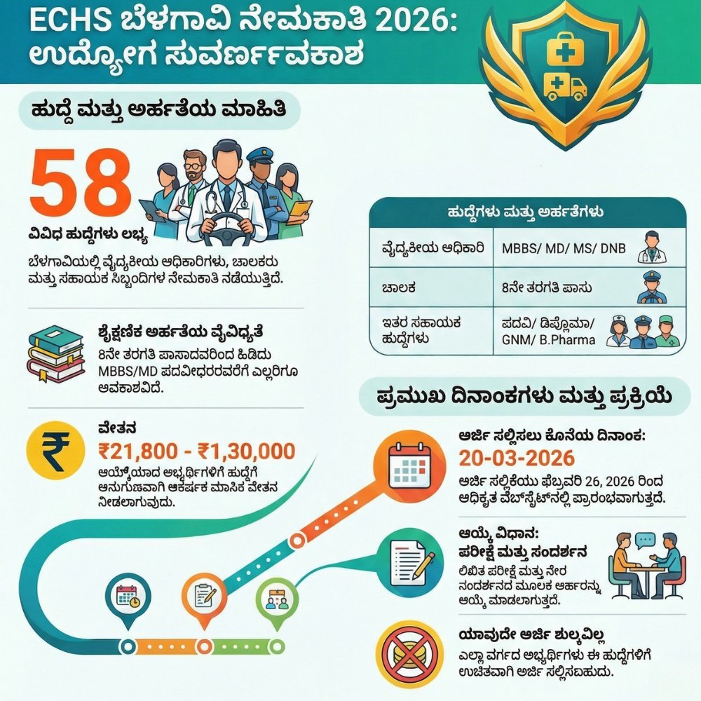 ನಮಸ್ಕಾರ ಸ್ನೇಹಿತರೆ, ಸರ್ಕಾರಿ ಕೆಲಸಕ್ಕಾಗಿ ಕಾಯುತ್ತಿರುವ ನಮ್ಮ ಕರ್ನಾಟಕದ ಅಭ್ಯರ್ಥಿಗಳಿಗೆ ಇದೀಗ ಒಂದು ಸುವರ್ಣಾವಕಾಶ ಬಂದಿದೆ. ಮಾಜಿ ಸೈನಿಕರ ಕೊಡುಗೆ ಆರೋಗ್ಯ ಯೋಜನೆ (ECHS) ವತಿಯಿಂದ ಬೆಳಗಾವಿಯಲ್ಲಿ ವಿವಿಧ ಹುದ್ದೆಗಳ ನೇಮಕಾತಿಗಾಗಿ ಅಧಿಕೃತ ಅಧಿಸೂಚನೆ ಪ್ರಕಟಿಸಲಾಗಿದೆ.