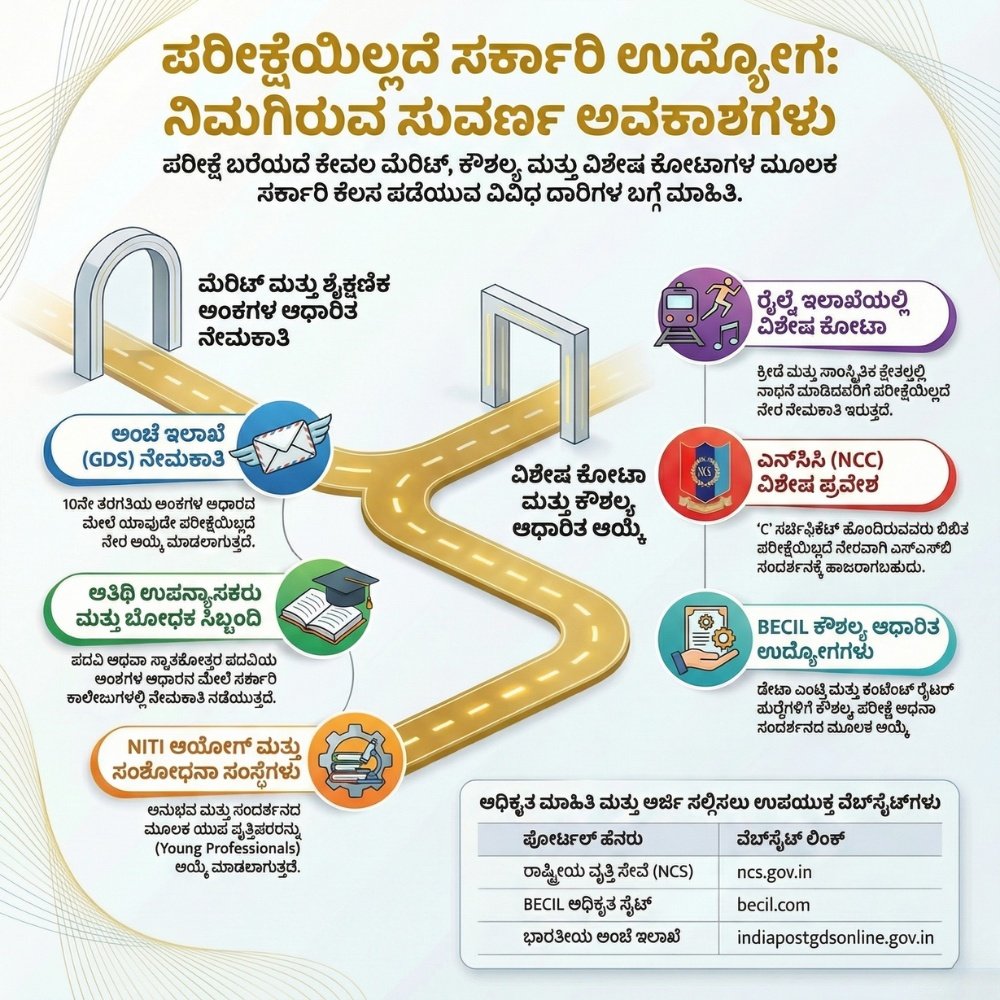ಹೆಲೋ ನಮಸ್ಕಾರ ಸ್ನೇಹಿತರೆ,ಸರ್ಕಾರಿ ಕೆಲಸ ಅಂದ ತಕ್ಷಣ ನಮಗೆ ಮೊದಲು ನೆನಪಿಗೆ ಬರುವುದು ಕಠಿಣವಾದ ಸ್ಪರ್ಧಾತ್ಮಕ ಪರೀಕ್ಷೆಗಳು ಮತ್ತು ವರ್ಷಗಟ್ಟಲೆ ಮಾಡುವ ತಯಾರಿ. ಆದರೆ, ನಿಮಗೆ ಗೊತ್ತಾ? ಯಾವುದೇ ಪರೀಕ್ಷೆ ಬರೆಯದೆ, ಕೇವಲ ನಿಮ್ಮ ಶೈಕ್ಷಣಿಕ ಅಂಕಗಳು (Merit), ಸಂದರ್ಶನ ಅಥವಾ ವಿಶೇಷ ಕೋಟಾಗಳ ಮೂಲಕವೇ ನೀವು ಸರ್ಕಾರಿ ಅಧಿಕಾರಿಯಾಗಬಹುದು.