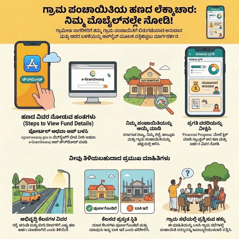 ಪಂಚಾಯಿತಿಯಲ್ಲಿ ಯಾರನ್ನಾದರೂ ಕೇಳಿದರೆ ಸರಿಯಾದ ಉತ್ತರ ಸಿಗಲ್ಲ ಅಂದುಕೊಂಡಿದ್ದೀರಾ? ಹಾಗಾದರೆ ಬಿಡಿ, ಈಗ ಕಾಲ ಬದಲಾಗಿದೆ. ನಿಮ್ಮ ಗ್ರಾಮ ಪಂಚಾಯಿತಿಗೆ ಬಿಡುಗಡೆಯಾದ ಕೋಟಿ ಕೋಟಿ ರೂಪಾಯಿಗಳ ಲೆಕ್ಕಾಚಾರವನ್ನು ಈಗ ನೀವು ನಿಮ್ಮ ಮೊಬೈಲ್ನಲ್ಲೇ ಕೇವಲ 2 ನಿಮಿಷಗಳಲ್ಲಿ ನೋಡಬಹುದು! ಅದು ಹೇಗೆ? ಇಲ್ಲಿದೆ ಕಂಪ್ಲೀಟ್ ಮಾಹಿತಿ.