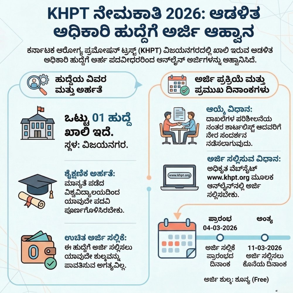 ಕರ್ನಾಟಕದಲ್ಲಿ ಉತ್ತಮ ಉದ್ಯೋಗಕ್ಕಾಗಿ ಕಾಯುತ್ತಿರುವವರಿಗೆ ಈಗ ಒಂದು ಉತ್ತಮ ಅವಕಾಶ ದೊರೆತಿದೆ. ಕರ್ನಾಟಕ ಆರೋಗ್ಯ ಪ್ರಮೋಷನ್ ಟ್ರಸ್ಟ್ (KHPT) ಸಂಸ್ಥೆ ಇದೀಗ ಖಾಲಿ ಇರುವ ಹುದ್ದೆಯನ್ನು ಭರ್ತಿ ಮಾಡಲು ಅರ್ಜಿಗಳನ್ನು ಆಹ್ವಾನಿಸಿದೆ. ವಿಶೇಷವೆಂದರೆ ಈ ನೇಮಕಾತಿಗೆ ಯಾವುದೇ ಅರ್ಜಿ ಶುಲ್ಕವಿಲ್ಲ, ಆದ್ದರಿಂದ ಅರ್ಹ ಅಭ್ಯರ್ಥಿಗಳು ಸುಲಭವಾಗಿ ಅರ್ಜಿ ಸಲ್ಲಿಸಬಹುದು.