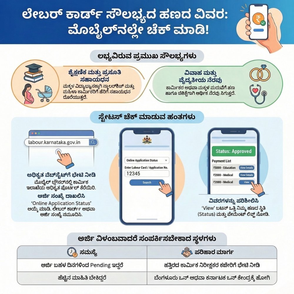 ಒಂದು ವೇಳೆ ನೀವು ಅರ್ಜಿ ಸಲ್ಲಿಸಿ ದೀರ್ಘಕಾಲವಾಗಿದ್ದರೂ ‘Pending’ ಎಂದು ತೋರಿಸುತ್ತಿದ್ದರೆ, ತಕ್ಷಣ ನಿಮ್ಮ ಹತ್ತಿರದ ‘ಕಾರ್ಮಿಕ ನಿರೀಕ್ಷಕರ ಕಚೇರಿ’ (Labour Inspector Office) ಅಥವಾ ಬೆಂಗಳೂರು ಒನ್/ಕರ್ನಾಟಕ ಒನ್ ಕೇಂದ್ರಕ್ಕೆ ಭೇಟಿ ನೀಡಿ ಮಾಹಿತಿ ಪಡೆಯಬಹುದು.