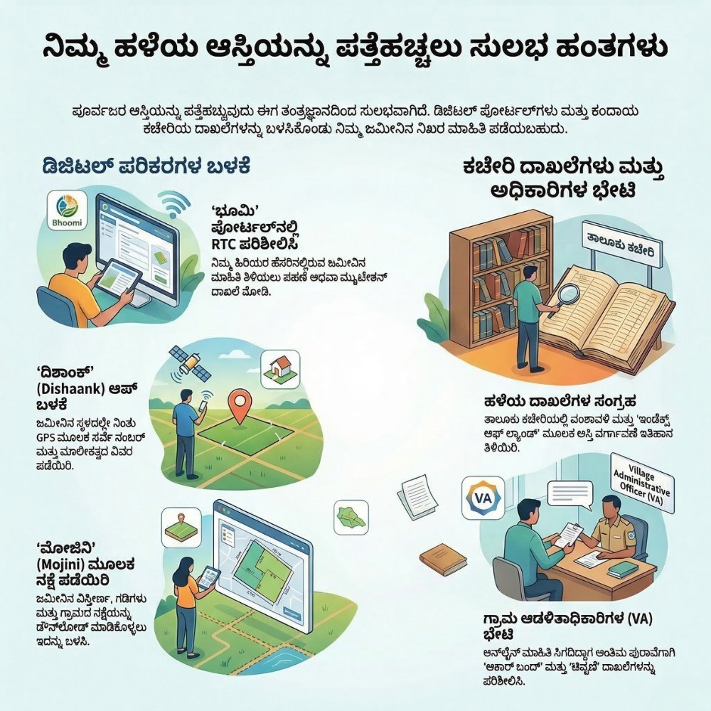 ನಮಸ್ಕಾರ ಕರ್ನಾಟಕದ ಜನತೆಗೆ, ಜಮೀನು ಎನ್ನುವುದು ಕೇವಲ ಮಣ್ಣಲ್ಲ, ಅದು ನಮ್ಮ ಪೂರ್ವಜರ ಆಸ್ತಿ ಮತ್ತು ಭಾವನೆ. ಆದರೆ ಕಾಲಾನಂತರದಲ್ಲಿ ದಾಖಲೆಗಳು ಕೈತಪ್ಪಿ ಅಥವಾ ಮಾಹಿತಿ ಇಲ್ಲದೆ ಎಷ್ಟೋ ಕುಟುಂಬಗಳು ತಮ್ಮ ಜಮೀನು ಎಲ್ಲಿದೆ ಎಂಬ ಗೊಂದಲದಲ್ಲಿ ಇರುತ್ತವೆ. ನಿಮ್ಮ ಹಳೆಯ ಆಸ್ತಿಯನ್ನು ಹುಡುಕುವುದು ಈಗ ಮೊದಲಿನಷ್ಟು ಕಷ್ಟವಿಲ್ಲ. ತಂತ್ರಜ್ಞಾನದ ಸಹಾಯದಿಂದ ನೀವು ಮನೆಯಲ್ಲೇ ಕುಳಿತು ನಿಮ್ಮ ಜಮೀನನ್ನು ಪತ್ತೆಹಚ್ಚಬಹುದು.