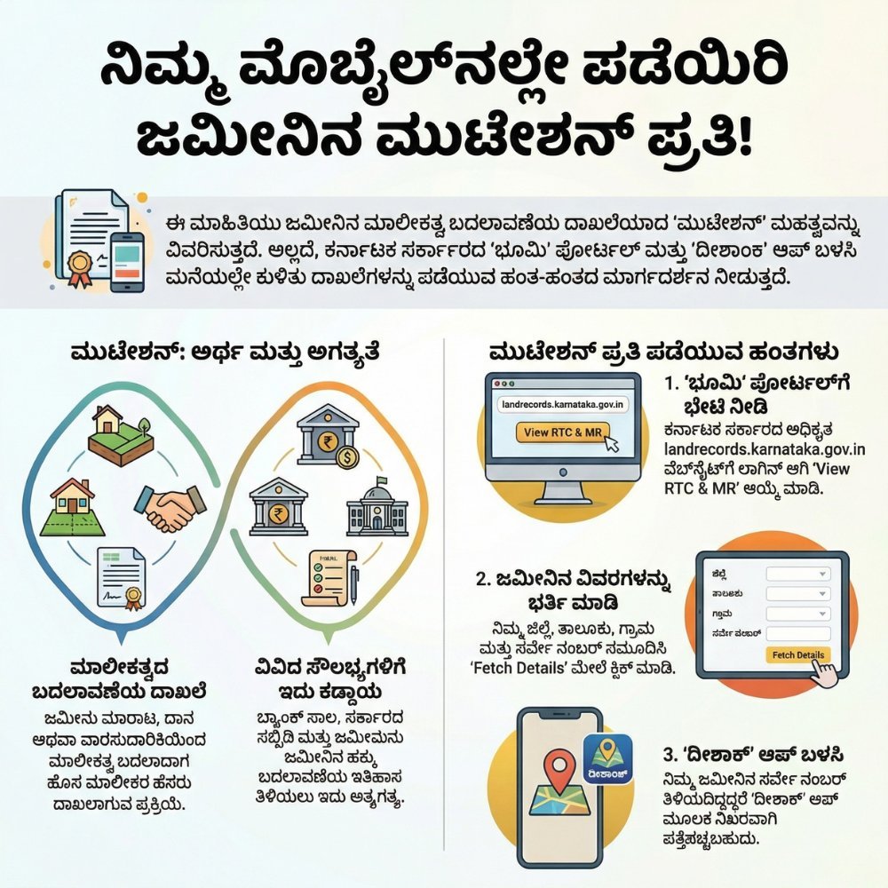ಜಮೀನಿನ ದಾಖಲೆಗಳು ಸರಿಯಾಗಿದ್ದರೆ ಮಾತ್ರ ಭವಿಷ್ಯದಲ್ಲಿ ಯಾವುದೇ ಕಾನೂನು ಸಮಸ್ಯೆಗಳು ಎದುರಾಗುವುದಿಲ್ಲ. ಆದ್ದರಿಂದ ಇಂದೇ ನಿಮ್ಮ ಮುಟೇಶನ್ ಪ್ರತಿ ಮತ್ತು ಪಹಣಿಯನ್ನು ಪರಿಶೀಲಿಸಿಕೊಳ್ಳಿ. ಕಚೇರಿಗಳಿಗೆ ಅಲೆದಾಡಿ ಸಮಯ ವ್ಯರ್ಥ ಮಾಡುವ ಬದಲು ಈ ಡಿಜಿಟಲ್ ಸೇವೆಯ ಪ್ರಯೋಜನ ಪಡೆದುಕೊಳ್ಳಿ.