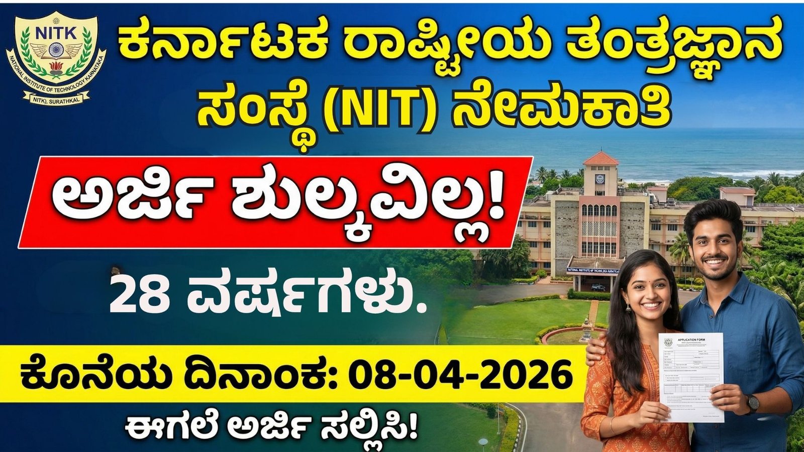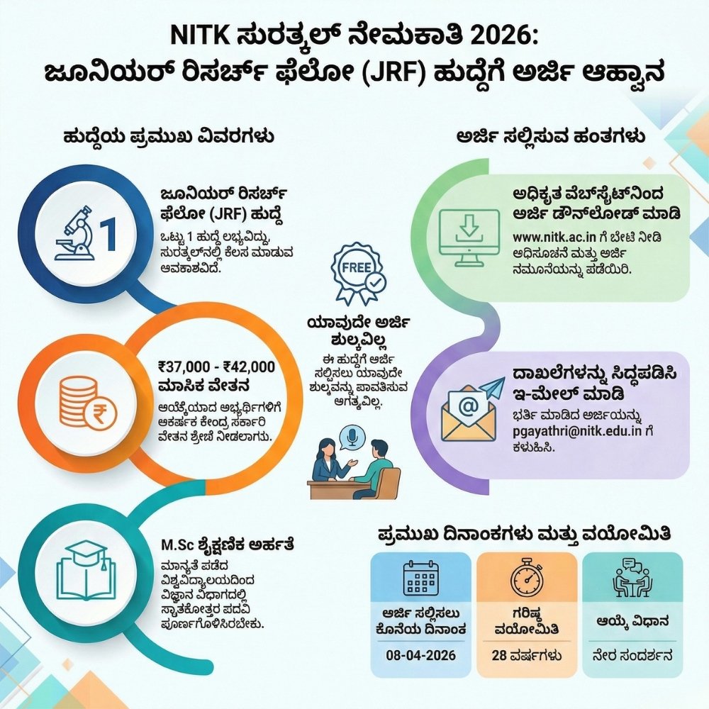 ಹಲೋ ಸ್ನೇಹಿತರೇ ನಮಸ್ಕಾರ,ನೀವು ವಿಜ್ಞಾನ ವಿಭಾಗದಲ್ಲಿ ಸ್ನಾತಕೋತ್ತರ ಪದವಿ (M.Sc) ಮುಗಿಸಿ ಉತ್ತಮ ಕೇಂದ್ರ ಸರ್ಕಾರಿ ಸಂಸ್ಥೆಯಲ್ಲಿ ಕೆಲಸ ಹುಡುಕುತ್ತಿದ್ದೀರಾ? ಹಾಗಿದ್ದರೆ ನಿಮಗೊಂದು ಸುವರ್ಣಾವಕಾಶ. ದಕ್ಷಿಣ ಕನ್ನಡ ಜಿಲ್ಲೆಯ ಪ್ರತಿಷ್ಠಿತ ಸಂಸ್ಥೆಯಾದ ರಾಷ್ಟ್ರೀಯ ತಂತ್ರಜ್ಞಾನ ಸಂಸ್ಥೆ ಕರ್ನಾಟಕ (NITK), ಸುರತ್ಕಲ್ ಇದೀಗ ಜೂನಿಯರ್ ರಿಸರ್ಚ್ ಫೆಲೋ (JRF) ಹುದ್ದೆಗೆ ಅರ್ಜಿ ಆಹ್ವಾನಿಸಿದೆ.