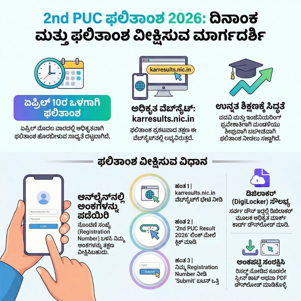 ಹಿಂದಿನ ವರ್ಷಗಳ ಟ್ರೆಂಡ್ ಹಾಗೂ ಮಂಡಳಿಯ ವೇಗವನ್ನು ಗಮನಿಸಿದರೆ, 2026ನೇ ಸಾಲಿನ ದ್ವಿತೀಯ ಪಿಯುಸಿ ಫಲಿತಾಂಶವು ಏಪ್ರಿಲ್ ಮೊದಲ ವಾರದಲ್ಲೇ ಹೊರಬೀಳುವ ಸಾಧ್ಯತೆ ದಟ್ಟವಾಗಿದೆ. ಮೂಲಗಳ ಪ್ರಕಾರ, ಏಪ್ರಿಲ್ 10ರ ಒಳಗಾಗಿ ಅಧಿಕೃತವಾಗಿ ರಿಸಲ್ಟ್ ಪ್ರಕಟವಾಗಲಿದೆ ಎಂದು ಹೇಳಲಾಗುತ್ತಿದೆ.