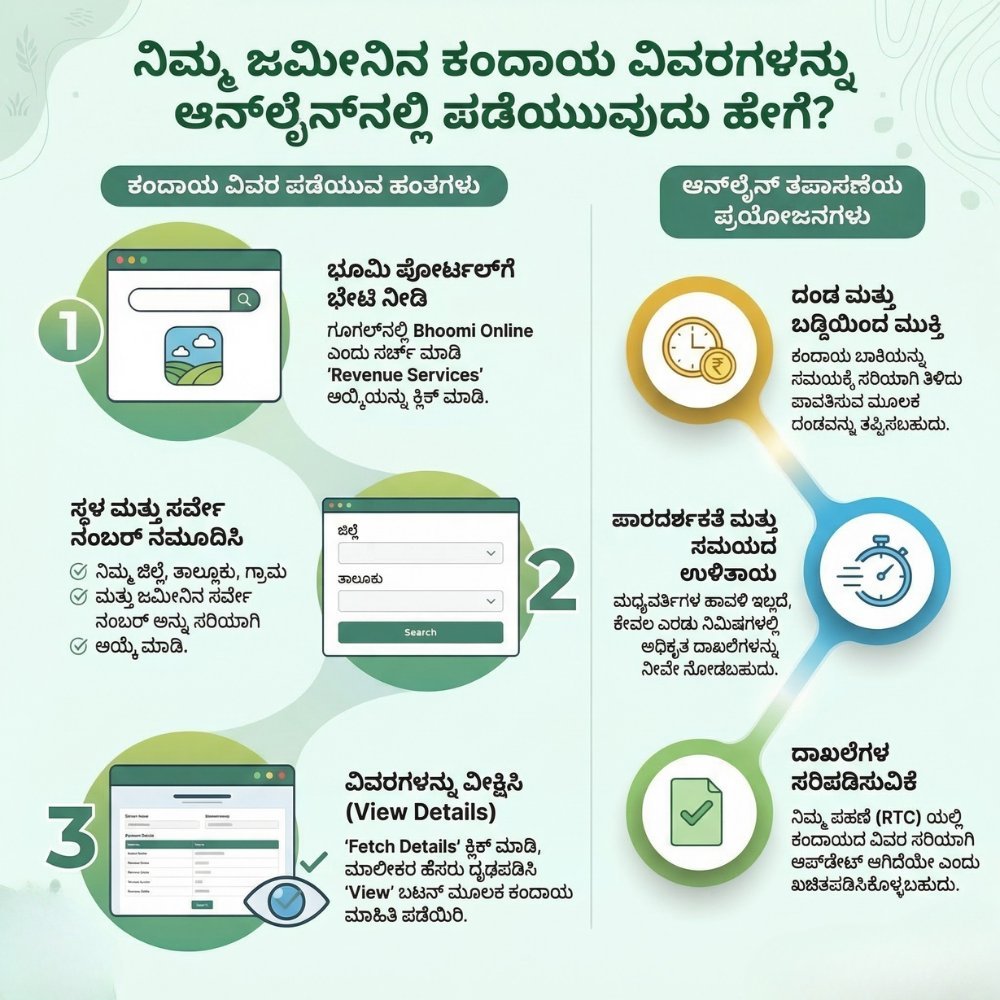 ಅನೇಕ ಬಾರಿ ಕಂದಾಯ ಕಟ್ಟದಿದ್ದರೆ ದಂಡ ಬೀಳುವ ಅಥವಾ ಮುಂದಿನ ದಿನಗಳಲ್ಲಿ ಪಹಣಿ (RTC) ಕೆಲಸಗಳಿಗೆ ತೊಂದರೆಯಾಗುವ ಸಾಧ್ಯತೆ ಇರುತ್ತದೆ. ಹಾಗಾದರೆ, ಆನ್‌ಲೈನ್‌ನಲ್ಲಿ ಇದನ್ನು ಚೆಕ್ ಮಾಡುವುದು ಹೇಗೆ? ಇಲ್ಲಿದೆ ನೋಡಿ ಸ್ಟೆಪ್-ಬೈ-ಸ್ಟೆಪ್ ಮಾಹಿತಿ.