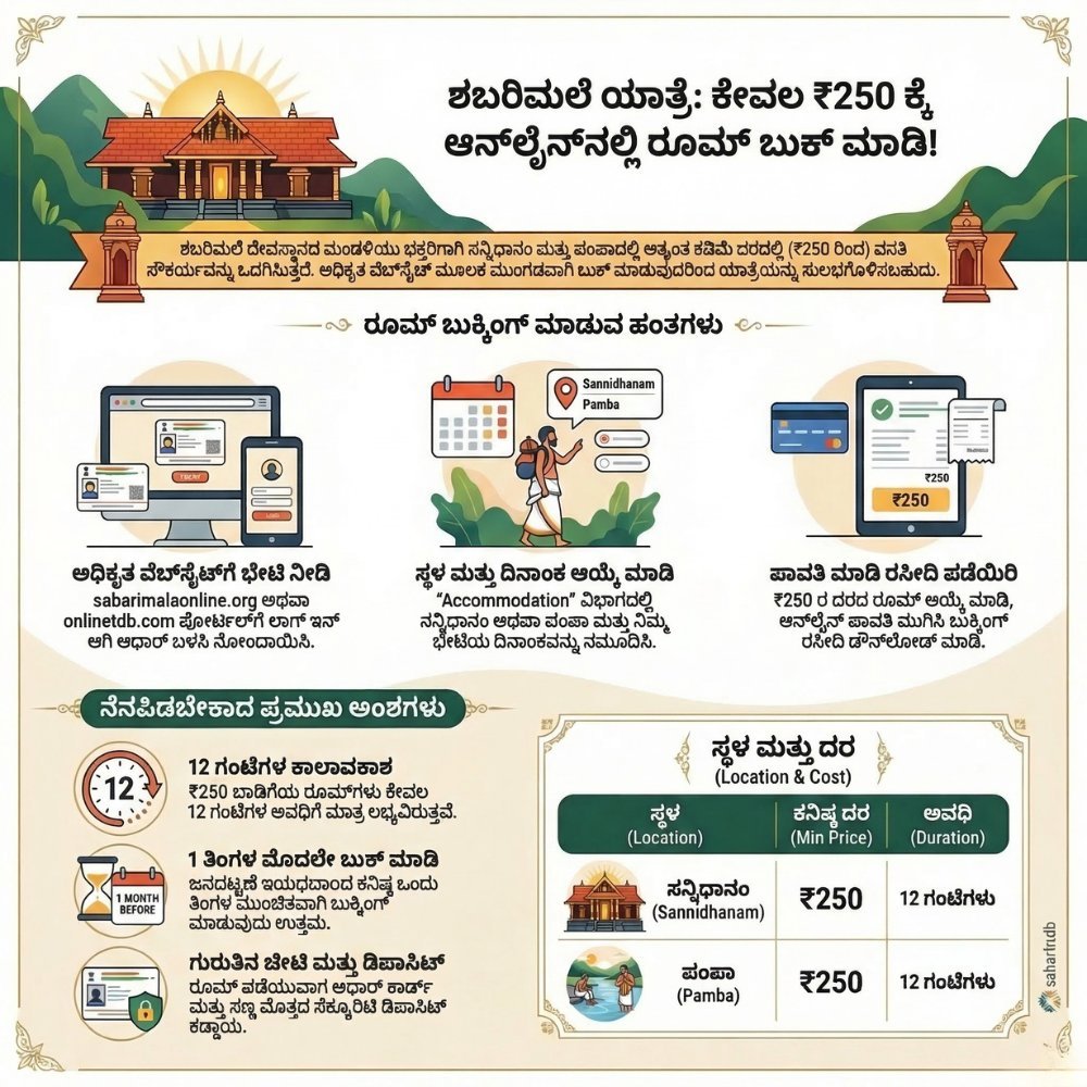 ಸ್ವಾಮಿಯೇ ಶರಣಂ ಅಯ್ಯಪ್ಪ! ಶಬರಿಮಲೆಗೆ ಹೋಗುವ ಭಕ್ತರಿಗೆ ರೂಮ್ ಸಿಗುವುದು ದೊಡ್ಡ ಸವಾಲು. ಆದರೆ ನೀವು ಕೇವಲ ₹250 ಕ್ಕೆ ಶಬರಿಮಲೆಯಲ್ಲಿ ರೂಮ್ ಪಡೆಯಬಹುದು ಎಂಬ ವಿಷಯ ನಿಮಗೆ ಗೊತ್ತೇ? ಹೌದು, ಅಯ್ಯಪ್ಪ ಸ್ವಾಮಿಯ ದರ್ಶನಕ್ಕೆ ಬರುವ ಸಾಮಾನ್ಯ ಭಕ್ತರಿಗಾಗಿ ದೇವಸ್ಥಾನದ ಮಂಡಳಿಯು ಅತ್ಯಂತ ಕಡಿಮೆ ದರದಲ್ಲಿ ವಸತಿ ಸೌಕರ್ಯ ಒದಗಿಸುತ್ತದೆ.