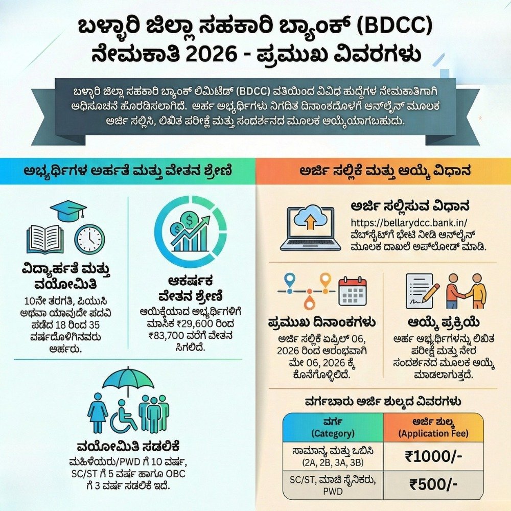 ನೀವು ಬ್ಯಾಂಕ್ ಉದ್ಯೋಗದ ಕನಸು ಕಾಣುತ್ತಿದ್ದೀರಾ? ಅದೂ ನಿಮ್ಮ ಸ್ವಂತ ಜಿಲ್ಲೆಯಲ್ಲೇ ಗೌರವಾನ್ವಿತ ಕೆಲಸ ಮಾಡಬೇಕೆಂಬ ಹಂಬಲವಿದೆಯೇ? ಹಾಗಿದ್ದರೆ ನಿಮಗಾಗಿ ಇಲ್ಲಿದೆ ಒಂದು ಸುವರ್ಣಾವಕಾಶ! ಬಳ್ಳಾರಿ ಜಿಲ್ಲಾ ಸಹಕಾರಿ ಬ್ಯಾಂಕ್ ಲಿಮಿಟೆಡ್ (BDCC) ಖಾಲಿ ಇರುವ ವಿವಿಧ ಹುದ್ದೆಗಳ ಭರ್ತಿಗೆ ಅಧಿಕೃತ ಅಧಿಸೂಚನೆ ಹೊರಡಿಸಿದೆ. 82 ಹುದ್ದೆಗಳಿಗೆ ಅರ್ಜಿ ಆಹ್ವಾನಿಸಲಾಗಿದ್ದು, ಆಸಕ್ತರು ಇಂದೇ ಈ ಲೇಖನವನ್ನು ಪೂರ್ತಿ ಓದಿ ಅರ್ಜಿ ಸಲ್ಲಿಸಿ.