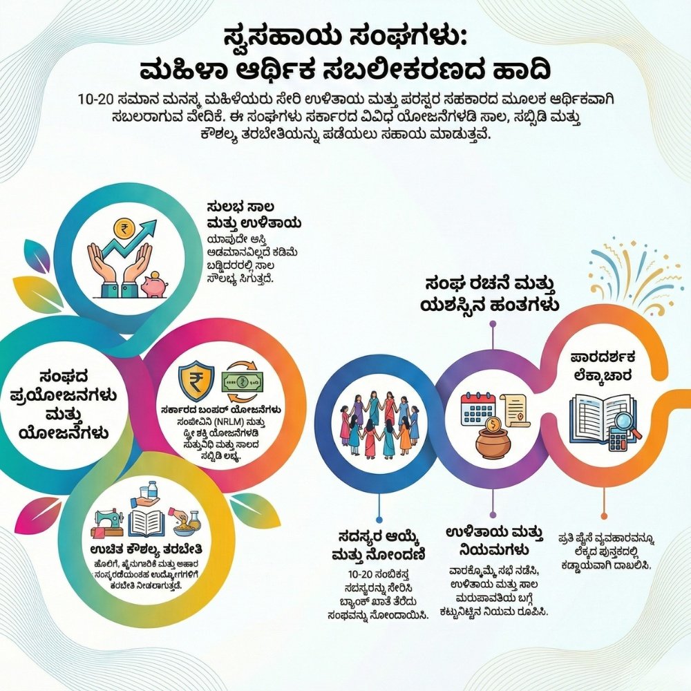 ನಮ್ಮ ರಾಜ್ಯದ ಲಕ್ಷಾಂತರ ಮಹಿಳೆಯರ ಬದುಕನ್ನೇ ಬದಲಿಸಿದ ‘ಸ್ವಸಹಾಯ ಸಂಘಗಳ’ (Self Help Groups) ಶಕ್ತಿ ಏನು? ಇದರಿಂದ ನೀವು ಏನೆಲ್ಲಾ ಲಾಭ ಪಡೆಯಬಹುದು? ಎಂಬ ಸಂಪೂರ್ಣ ಮಾಹಿತಿ ಇಲ್ಲಿದೆ. ಕೊನೆಯವರೆಗೂ ಓದಿ, ಇದು ನಿಮ್ಮ ಬದುಕಿನ ಹೊಸ ದಾರಿಗೆ ನಾಂದಿಯಾಗಬಹುದು.