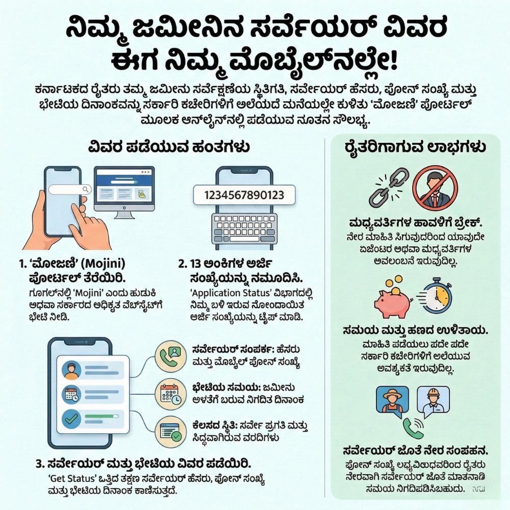 - ನೇರ ಸಂಪರ್ಕ: ಸರ್ವೇಯರ್ ನಂಬರ್ ಸಿಗುವುದರಿಂದ ನೀವು ಅವರೊಂದಿಗೆ ನೇರವಾಗಿ ಮಾತನಾಡಿ ಸಮಯವನ್ನು ನಿಗದಿಪಡಿಸಿಕೊಳ್ಳಬಹುದು.
