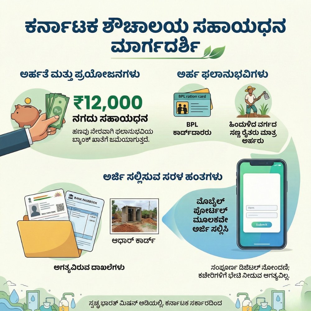 ನಮಸ್ಕಾರ ಸ್ನೇಹಿತರೇ, ನಿಮ್ಮ ಮನೆಯಲ್ಲಿ ಇನ್ನು ಶೌಚಾಲಯವಿಲ್ಲವೇ? ಅಥವಾ ಹಳೆಯ ಶೌಚಾಲಯವನ್ನು ಸರಿಪಡಿಸಿಕೊಳ್ಳಬೇಕೇ? ಹಾಗಿದ್ದರೆ ನಿಮಗೊಂದು ಭರ್ಜರಿ ಸಿಹಿಸುದ್ದಿ! ಕೇಂದ್ರ ಸರ್ಕಾರದ ‘ಸ್ವಚ್ಛ ಭಾರತ್ ಮಿಷನ್’ ಅಡಿಯಲ್ಲಿ ಶೌಚಾಲಯ ನಿರ್ಮಾಣಕ್ಕಾಗಿ ಪ್ರತಿ ಕುಟುಂಬಕ್ಕೆ 12,000 ರೂಪಾಯಿ ಧನಸಹಾಯ ನೀಡಲಾಗುತ್ತಿದೆ.