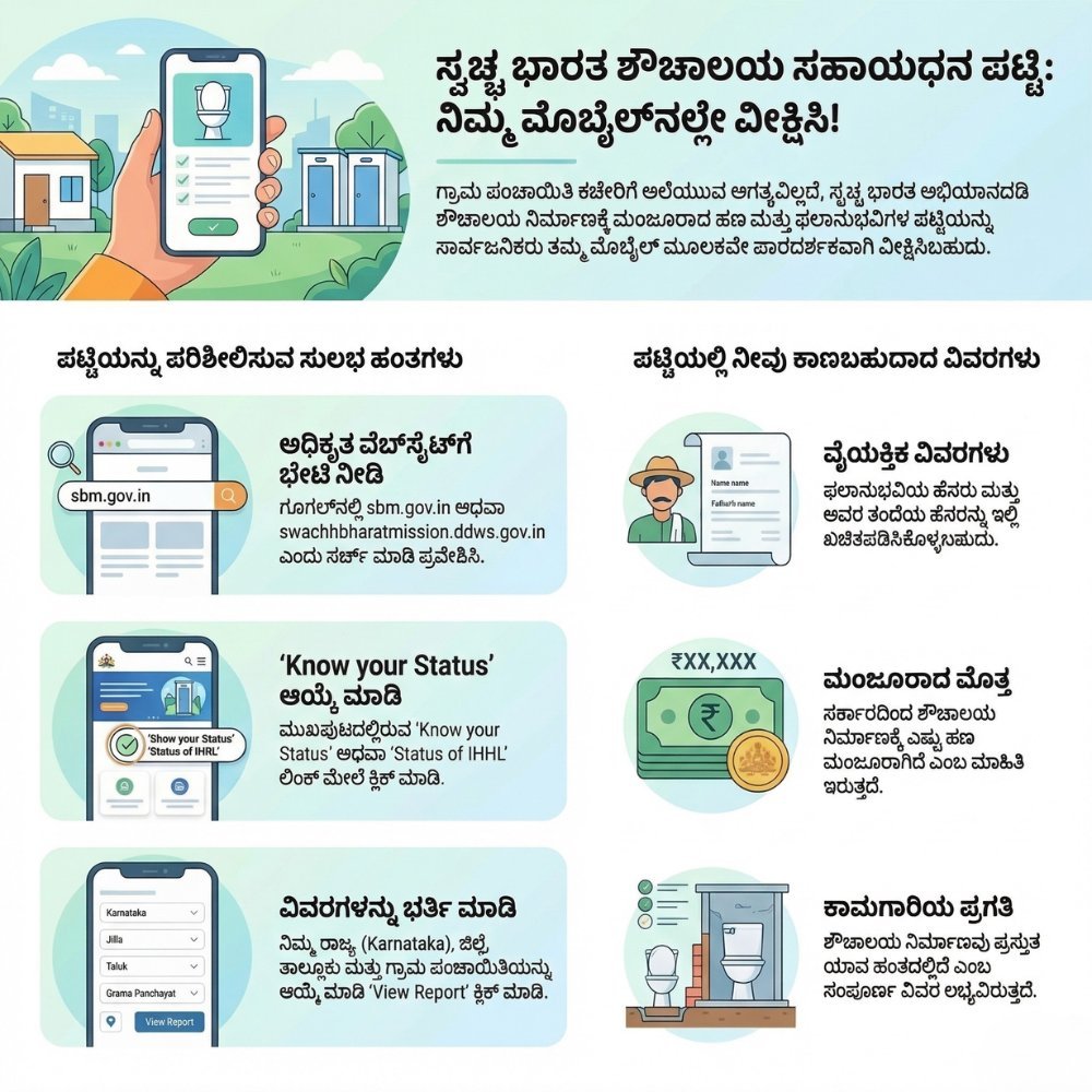 ನಿಮ್ಮ ಗ್ರಾಮ ಪಂಚಾಯಿತಿಯಲ್ಲಿ ಯಾರಿಗೆಲ್ಲಾ ಹೊಸದಾಗಿ ಶೌಚಾಲಯ (Toilet) ನಿರ್ಮಿಸಲು ಸರ್ಕಾರದಿಂದ ಹಣ ಮಂಜೂರಾಗಿದೆ ಎಂದು ತಿಳಿಯಬೇಕೆ? ಈಗ ನೀವು ಪಂಚಾಯಿತಿ ಕಚೇರಿಗೆ ಅಲೆಯುವ ಅಗತ್ಯವಿಲ್ಲ! ನಿಮ್ಮ ಕೈಯಲ್ಲಿರುವ ಮೊಬೈಲ್ ಮೂಲಕವೇ ಕೇವಲ ಎರಡೇ ನಿಮಿಷದಲ್ಲಿ ಸಂಪೂರ್ಣ ಪಟ್ಟಿಯನ್ನು ನೋಡಬಹುದು.