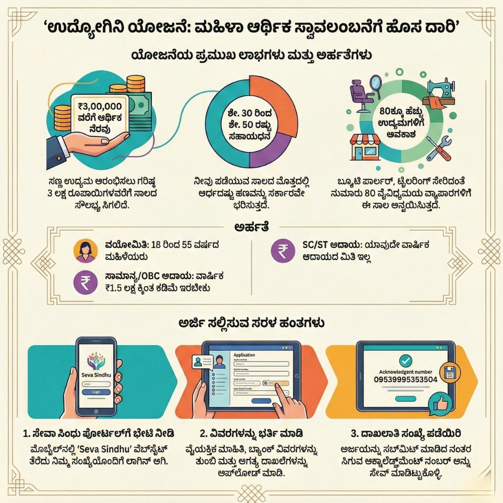 ನಮಸ್ಕಾರ ಸ್ನೇಹಿತರೇ, ಸ್ವಂತ ಉದ್ಯೋಗ ಮಾಡಬೇಕು, ಆರ್ಥಿಕವಾಗಿ ಸ್ವಾವಲಂಬಿಯಾಗಬೇಕು ಎಂಬ ಕನಸು ಪ್ರತಿಯೊಬ್ಬ ಮಹಿಳೆಯಲ್ಲೂ ಇರುತ್ತದೆ. ಆದರೆ ಸರಿಯಾದ ಬಂಡವಾಳವಿಲ್ಲದೆ ಅನೇಕರು ಈ ಕನಸನ್ನು ಅರ್ಧಕ್ಕೆ ಬಿಡುತ್ತಾರೆ. ಇನ್ನು ಮುಂದೆ ಆ ಚಿಂತೆ ಬೇಡ! ಕರ್ನಾಟಕ ಸರ್ಕಾರದ ಉದ್ಯೋಗಿನಿ ಯೋಜನೆ’ (Udyogini Scheme) ಮಹಿಳೆಯರ ಕೈ ಹಿಡಿಯಲು ಸಿದ್ಧವಾಗಿದೆ.