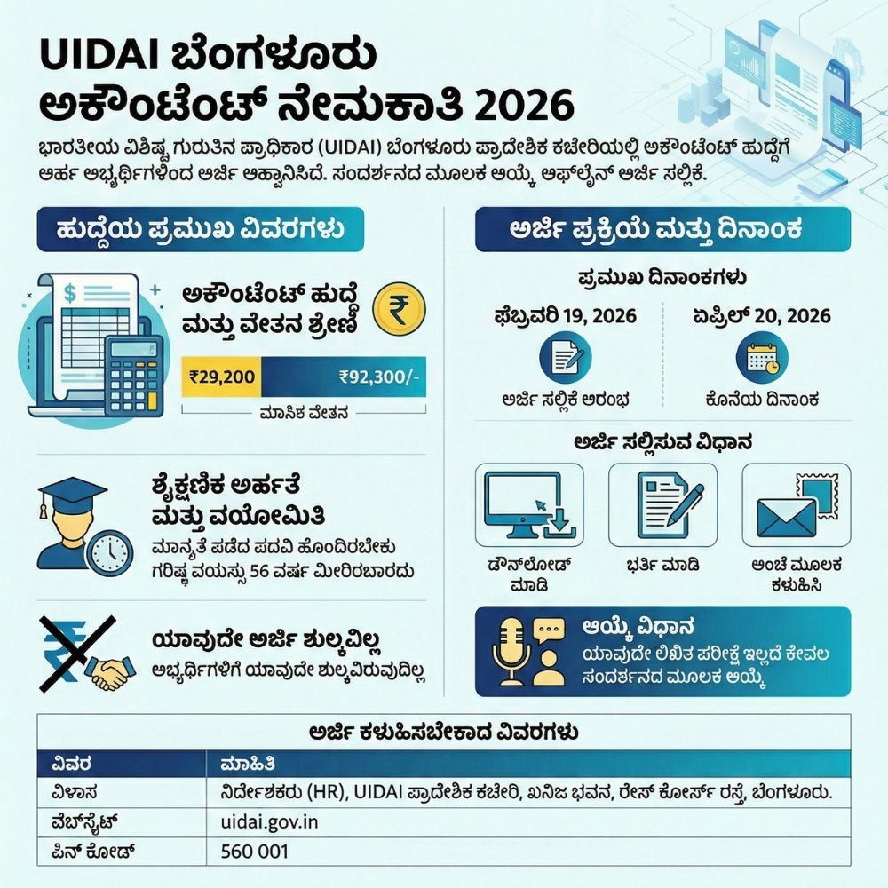 ಹಲೋ ಸ್ನೇಹಿತರೇ ನಮಸ್ಕಾರ, ಸರ್ಕಾರಿ ಉದ್ಯೋಗದ ಹುಡುಕಾಟದಲ್ಲಿರುವ ಅಭ್ಯರ್ಥಿಗಳಿಗೆ, ವಿಶೇಷವಾಗಿ ಬೆಂಗಳೂರಿನಲ್ಲಿ ಕೆಲಸ ಮಾಡಲು ಆಸಕ್ತಿ ಇರುವವರಿಗೆ ಇದು ಉತ್ತಮ ಅವಕಾಶ. Unique Identification Authority of India (UIDAI) ವತಿಯಿಂದ ಅಕೌಂಟೆಂಟ್ ಹುದ್ದೆಗೆ ಅರ್ಜಿ ಆಹ್ವಾನಿಸಲಾಗಿದೆ.