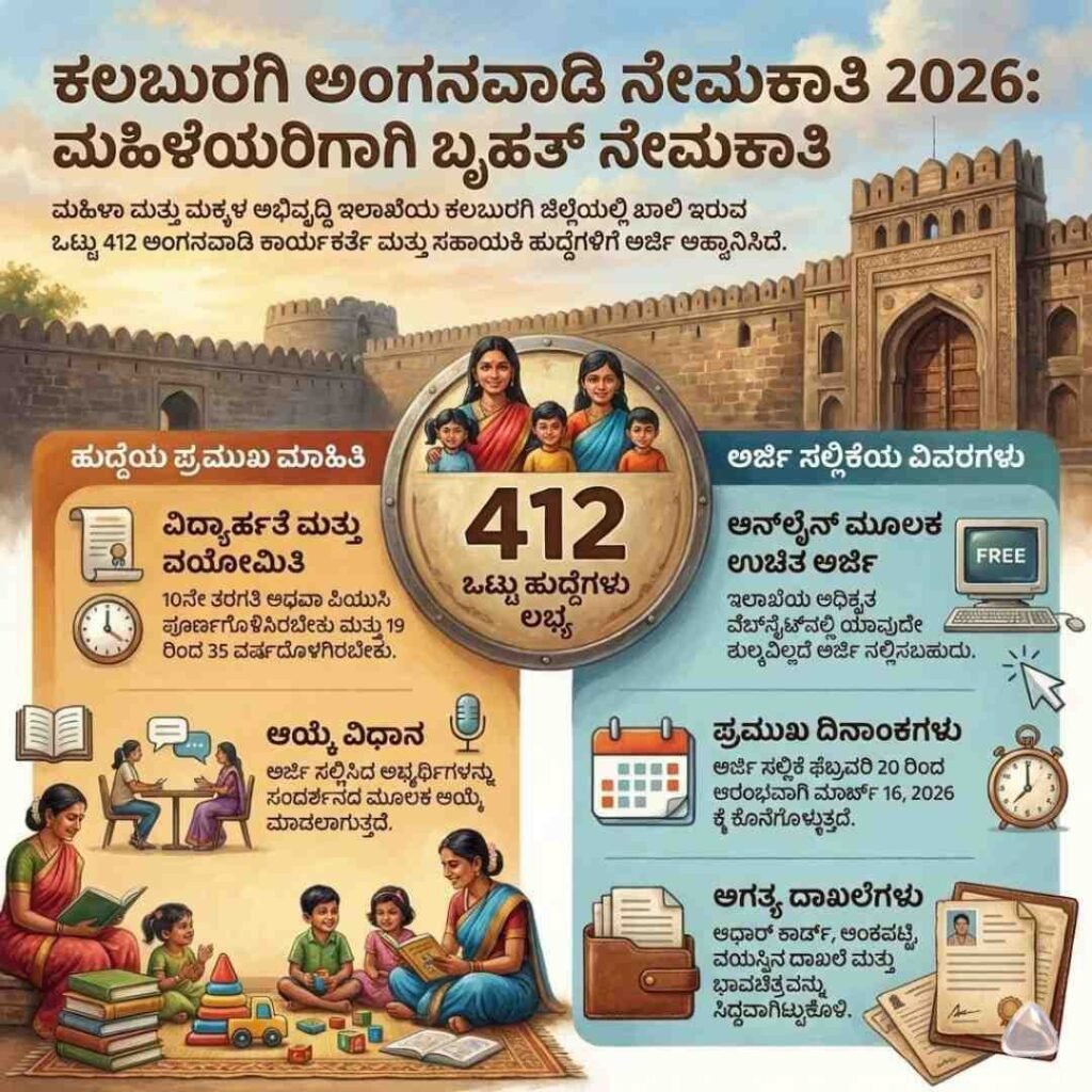 ಕಲಬುರಗಿ ಜಿಲ್ಲೆಯಲ್ಲಿ ಸರ್ಕಾರಿ ಉದ್ಯೋಗವನ್ನು ಹುಡುಕುತ್ತಿರುವ ಮಹಿಳಾ ಅಭ್ಯರ್ಥಿಗಳಿಗೆ ಸುವರ್ಣ ಅವಕಾಶ ದೊರೆತಿದೆ. ಮಹಿಳಾ ಮತ್ತು ಮಕ್ಕಳ ಅಭಿವೃದ್ಧಿ ಇಲಾಖೆಯು (WCD) ಜಿಲ್ಲೆಯ ವಿವಿಧ ಅಂಗನವಾಡಿ ಕೇಂದ್ರಗಳಲ್ಲಿ ಖಾಲಿ ಇರುವ ಹುದ್ದೆಗಳ ಭರ್ತಿಗೆ ಅಧಿಕೃತ ಅಧಿಸೂಚನೆಯನ್ನು ಹೊರಡಿಸಿದೆ.
