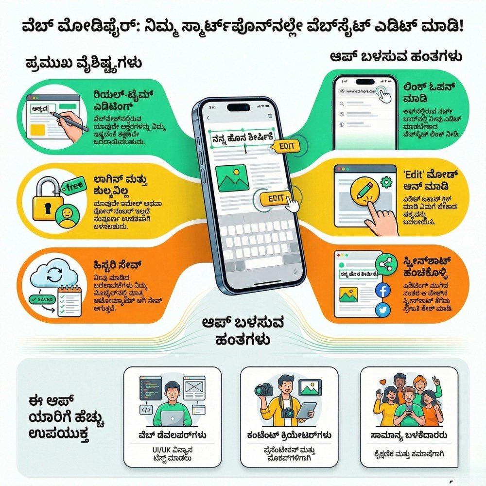 ಸಾಮಾನ್ಯವಾಗಿ ವೆಬ್ಸೈಟ್ನ ಕೋಡ್ ಅಥವಾ ಕಂಟೆಂಟ್ ಬದಲಾಯಿಸಲು ಡೆವಲಪರ್ಗಳಿಗೆ ಮಾತ್ರ ಸಾಧ್ಯ. ಆದರೆ, ‘Web Modifier’ ಎನ್ನುವ ಆಂಡ್ರಾಯ್ಡ್ ಆಪ್ ಸಾಮಾನ್ಯ ಬಳಕೆದಾರರಿಗೂ ಲೈವ್ ವೆಬ್ಪೇಜ್ನ ಕಂಟೆಂಟ್ ಅನ್ನು ಎಡಿಟ್ ಮಾಡಲು (Inspect Element ತರಹ) ಅವಕಾಶ ನೀಡುತ್ತದೆ.
